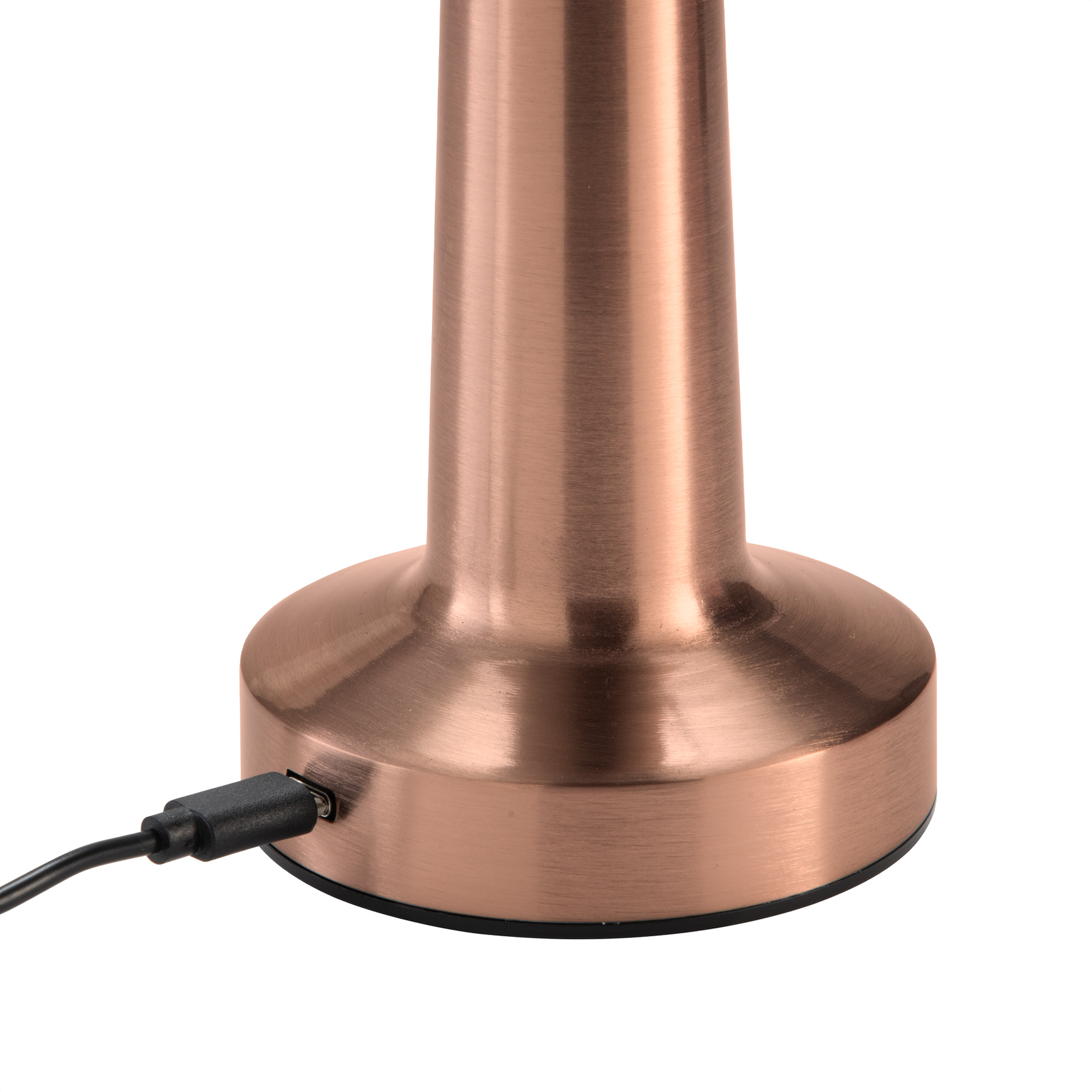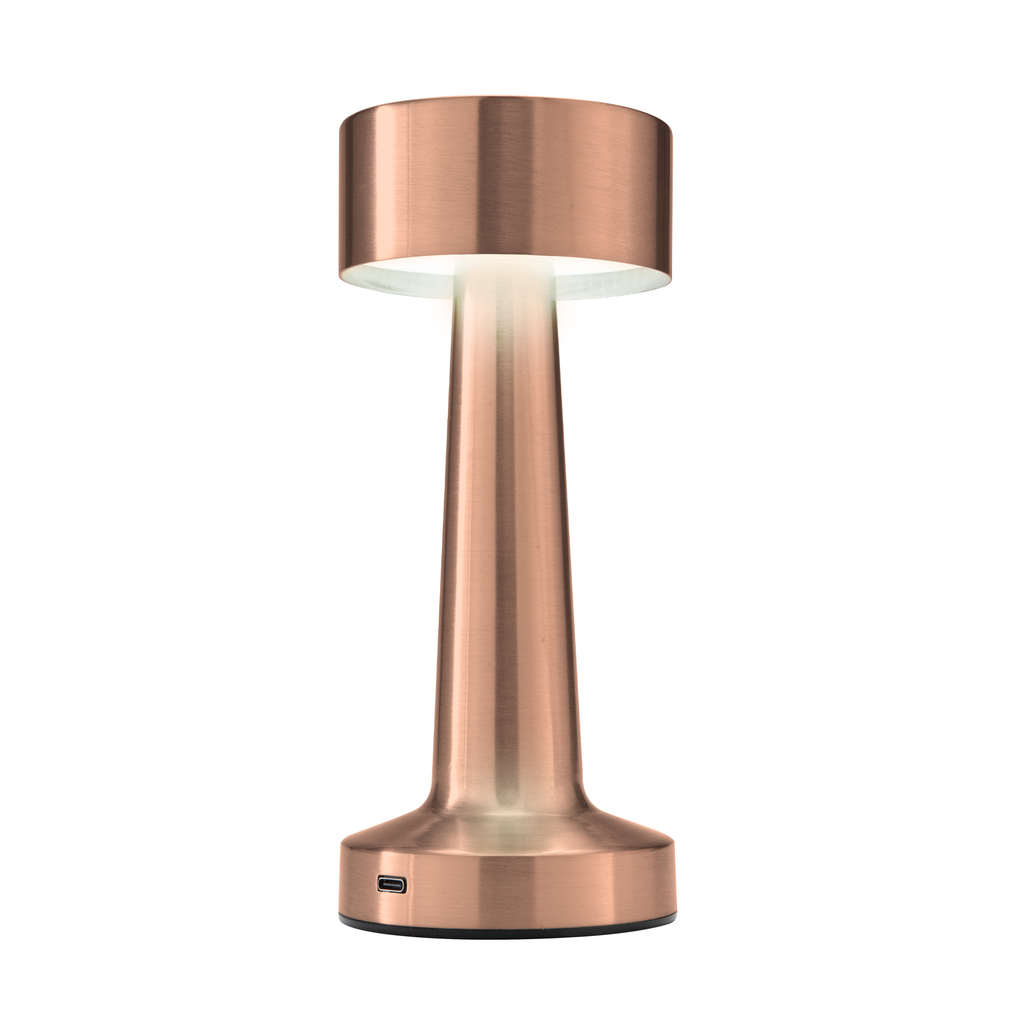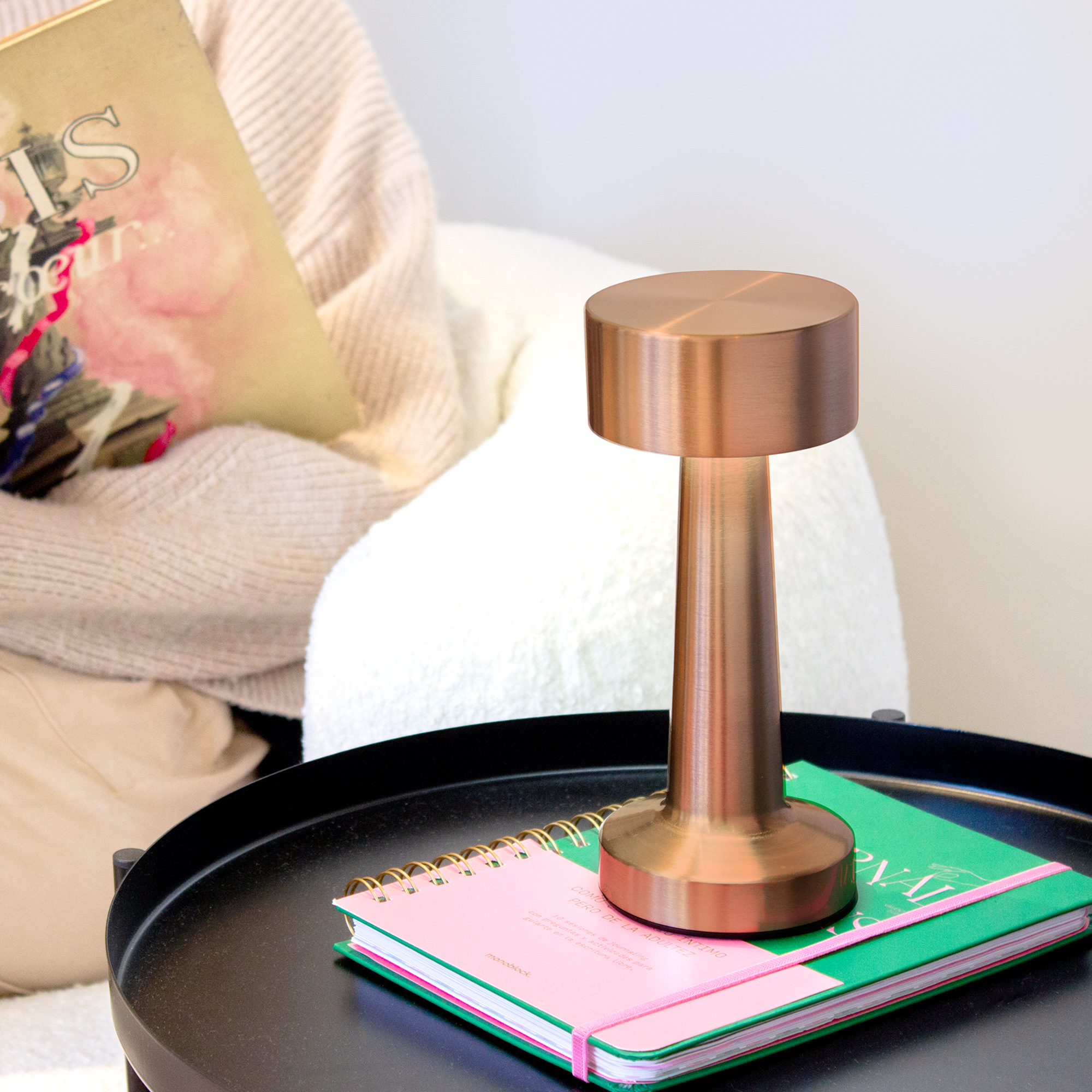 Lámpara. Luz led. Botón táctil de encendido/apagado que regula la intensidad y cambia tres modos de luz (cálida, blanca y blanca cálida). Pintura con acabado mate (color negro) y con acabado brillante (plata y cobre). Batería de litio recargable. Conexión USB-C. Incluye cable de carga color negro.
