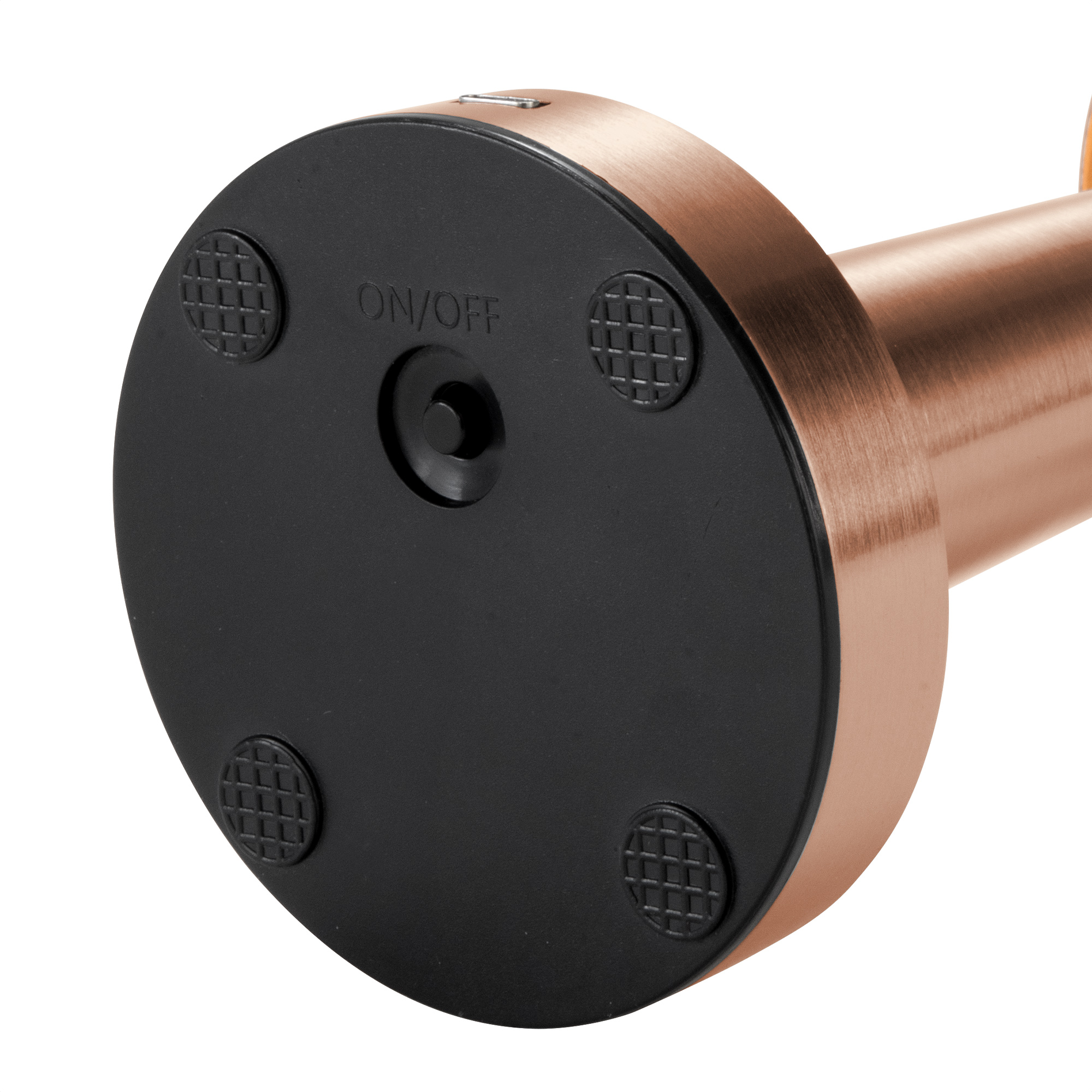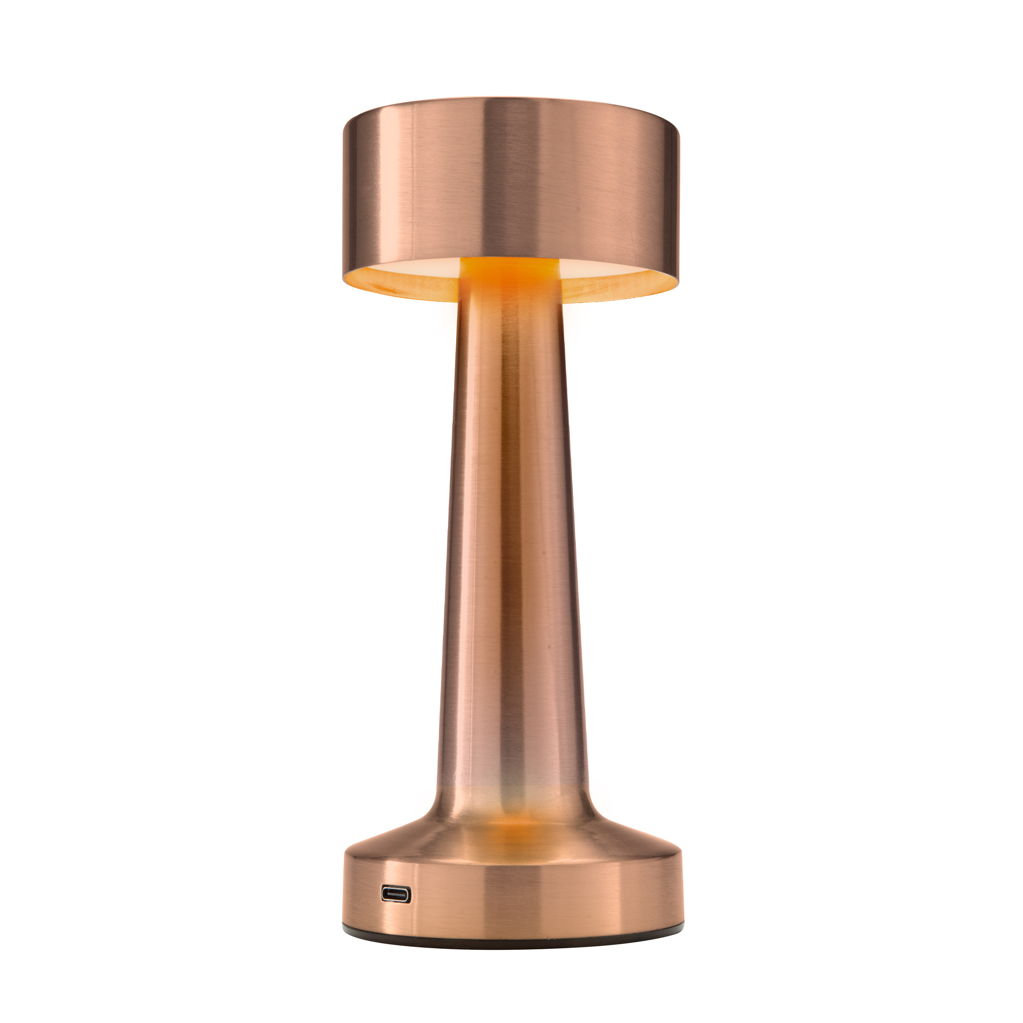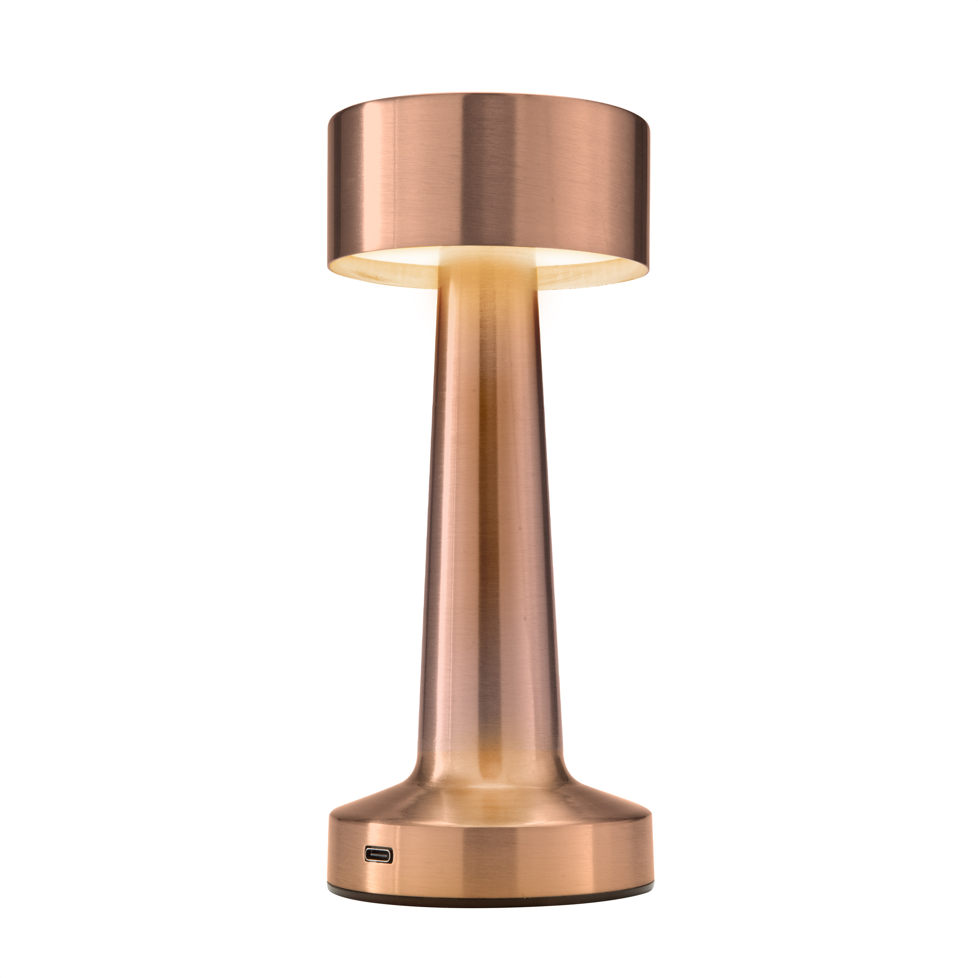 Lámpara. Luz led. Botón táctil de encendido/apagado que regula la intensidad y cambia tres modos de luz (cálida, blanca y blanca cálida). Pintura con acabado mate (color negro) y con acabado brillante (plata y cobre). Batería de litio recargable. Conexión USB-C. Incluye cable de carga color negro.