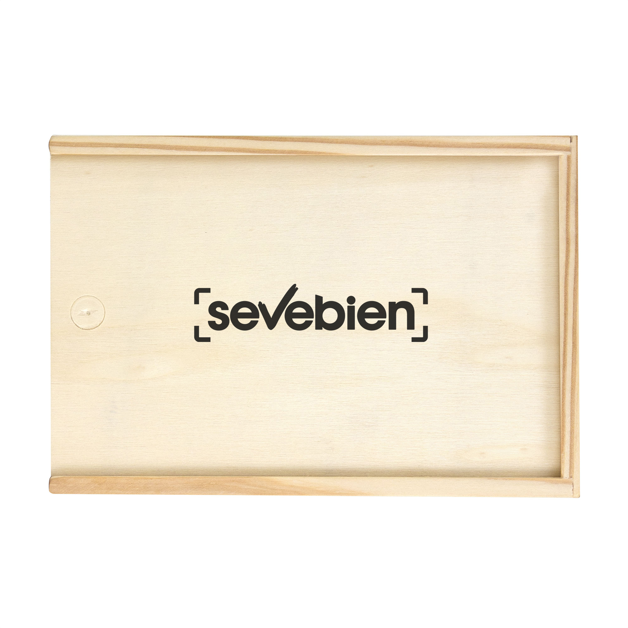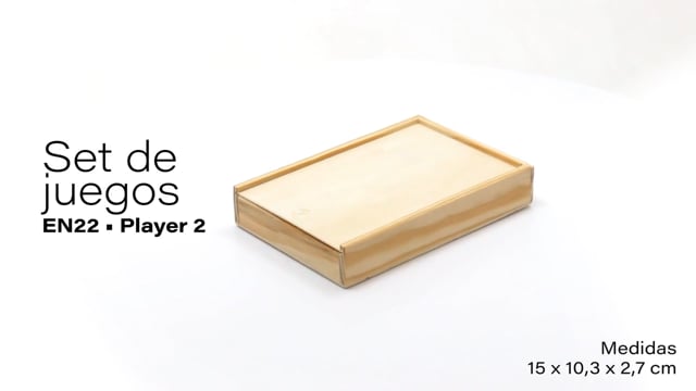 15 x 10,3 x 2,7 cm. Madera y papel plastificado. Set de entretenimiento. Incluye: 2 juegos de cartas de poker plastificadas y 5 dados de madera de cerezo. Caja contenedora de madera de pino y tapa deslizable en polywood. Presentación en caja de regalo kraft.