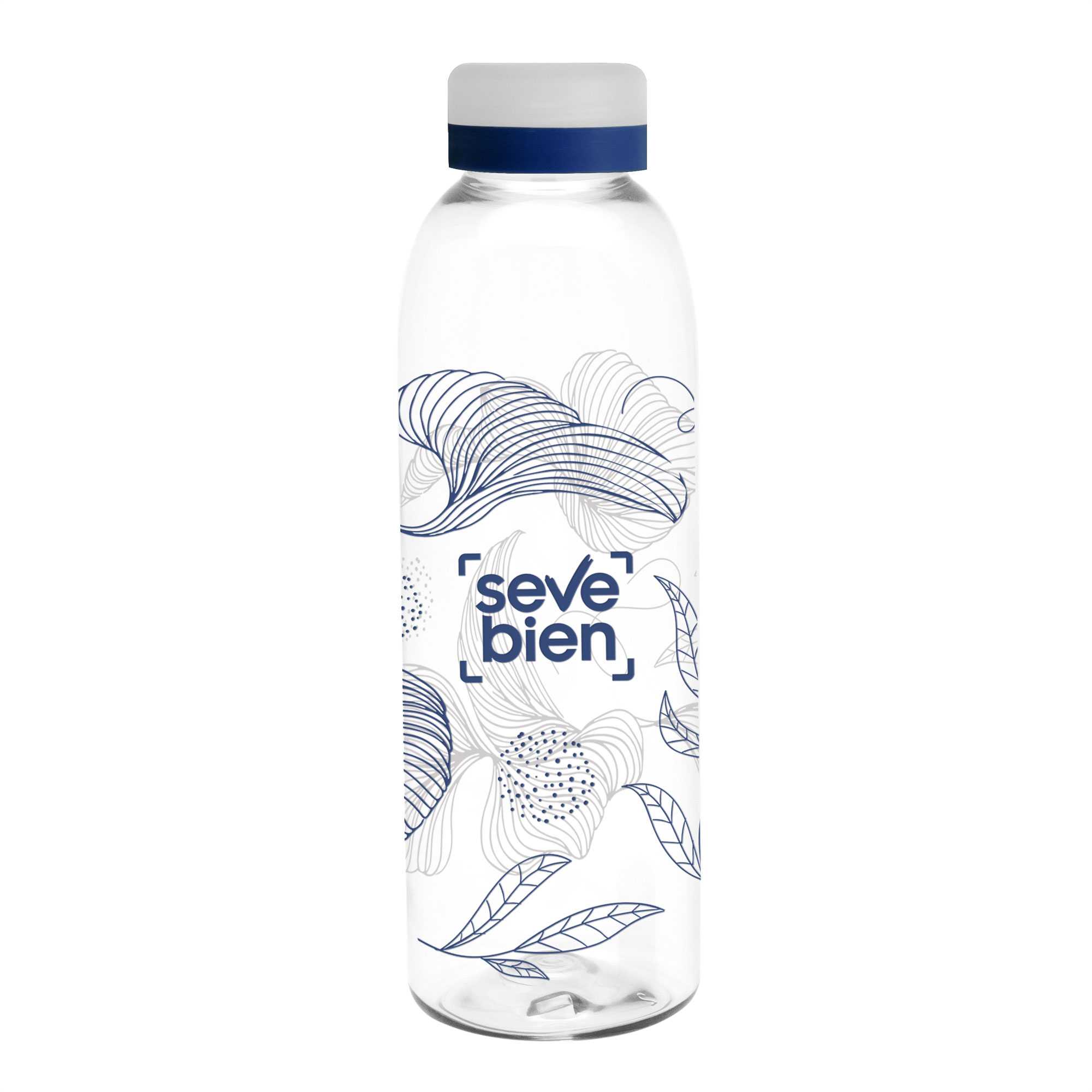 Botella de plástico transparente con tapa a rosca esmerilada con anillo de silicona de diferentes colores.