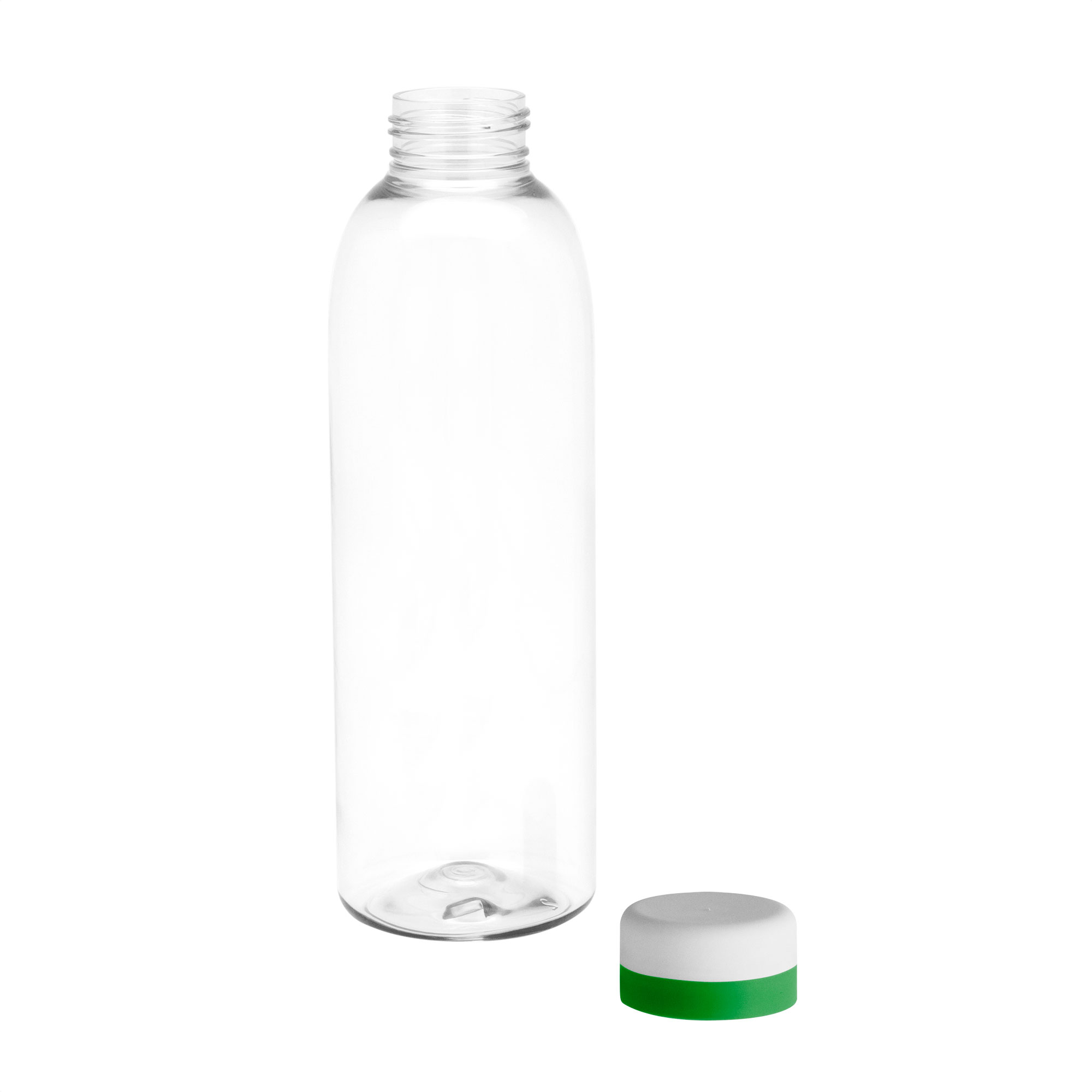 Botella de plástico transparente con tapa a rosca esmerilada con anillo de silicona de diferentes colores.