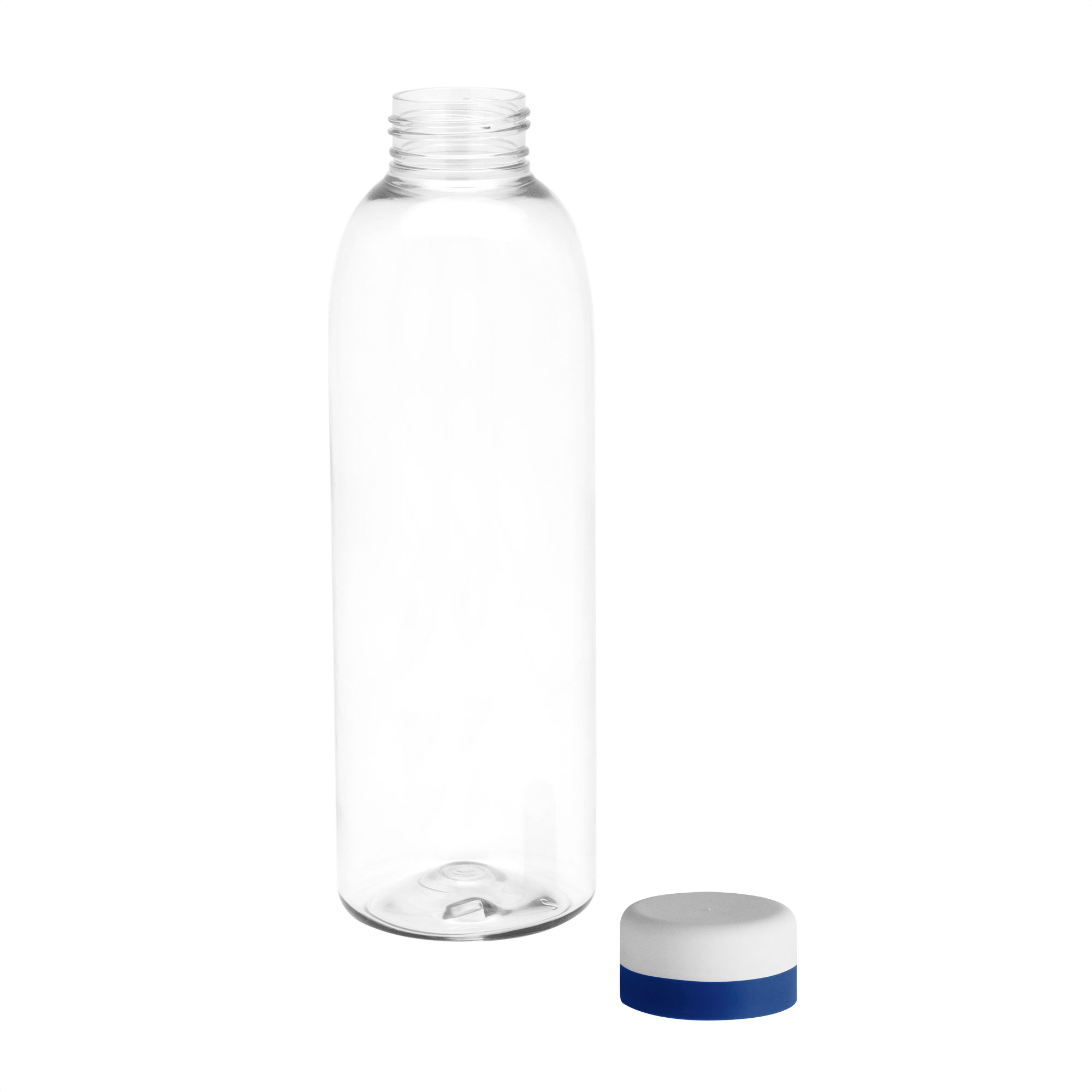 Botella de plástico transparente con tapa a rosca color blanco mate con anillo de silicona de diferentes colores.