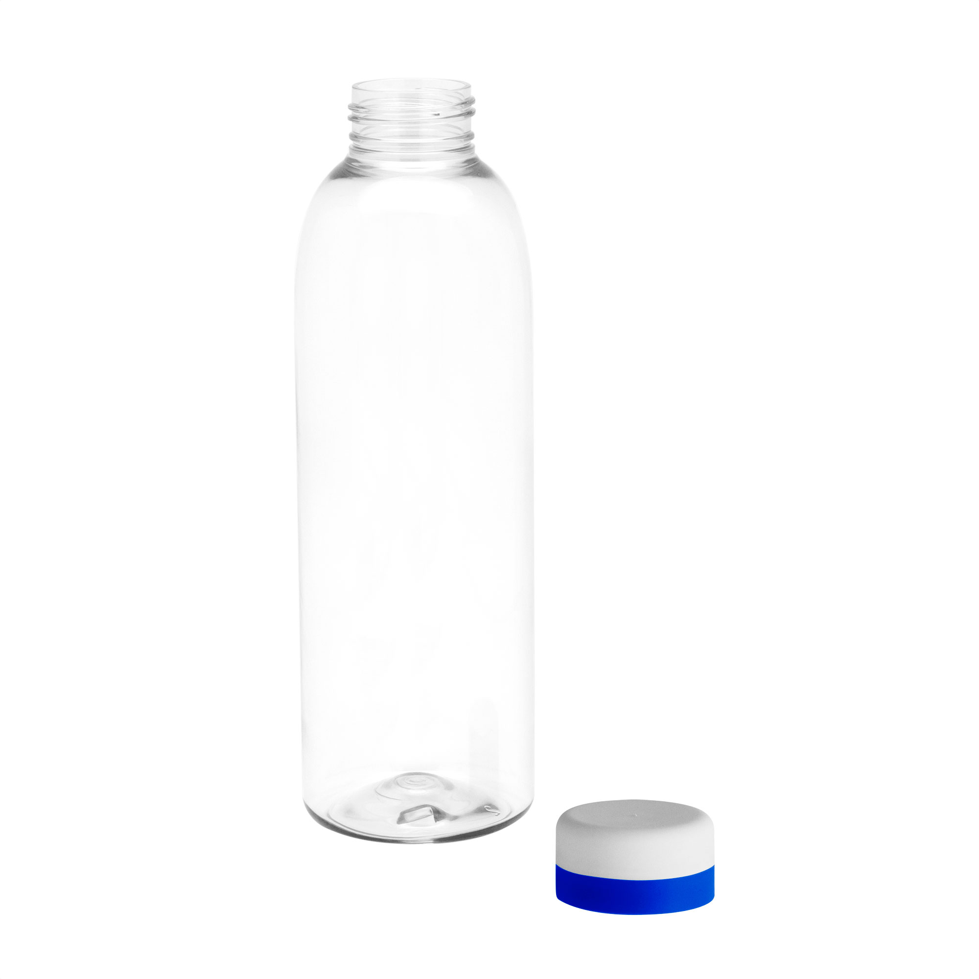 Botella de plástico transparente con tapa a rosca color blanco mate con anillo de silicona de diferentes colores.