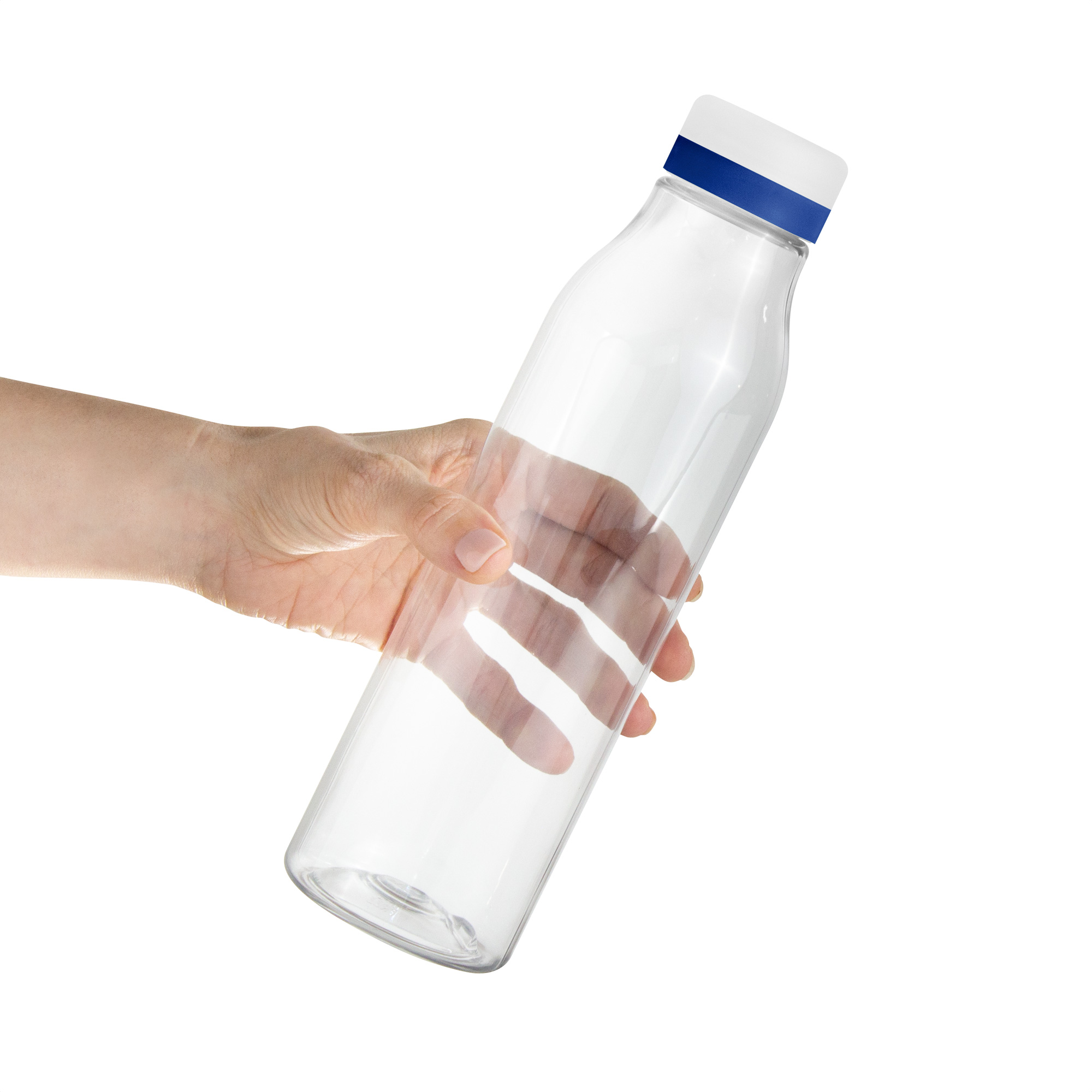 Botella de plástico transparente con tapa a rosca esmerilada con anillo de silicona de diferentes colores.