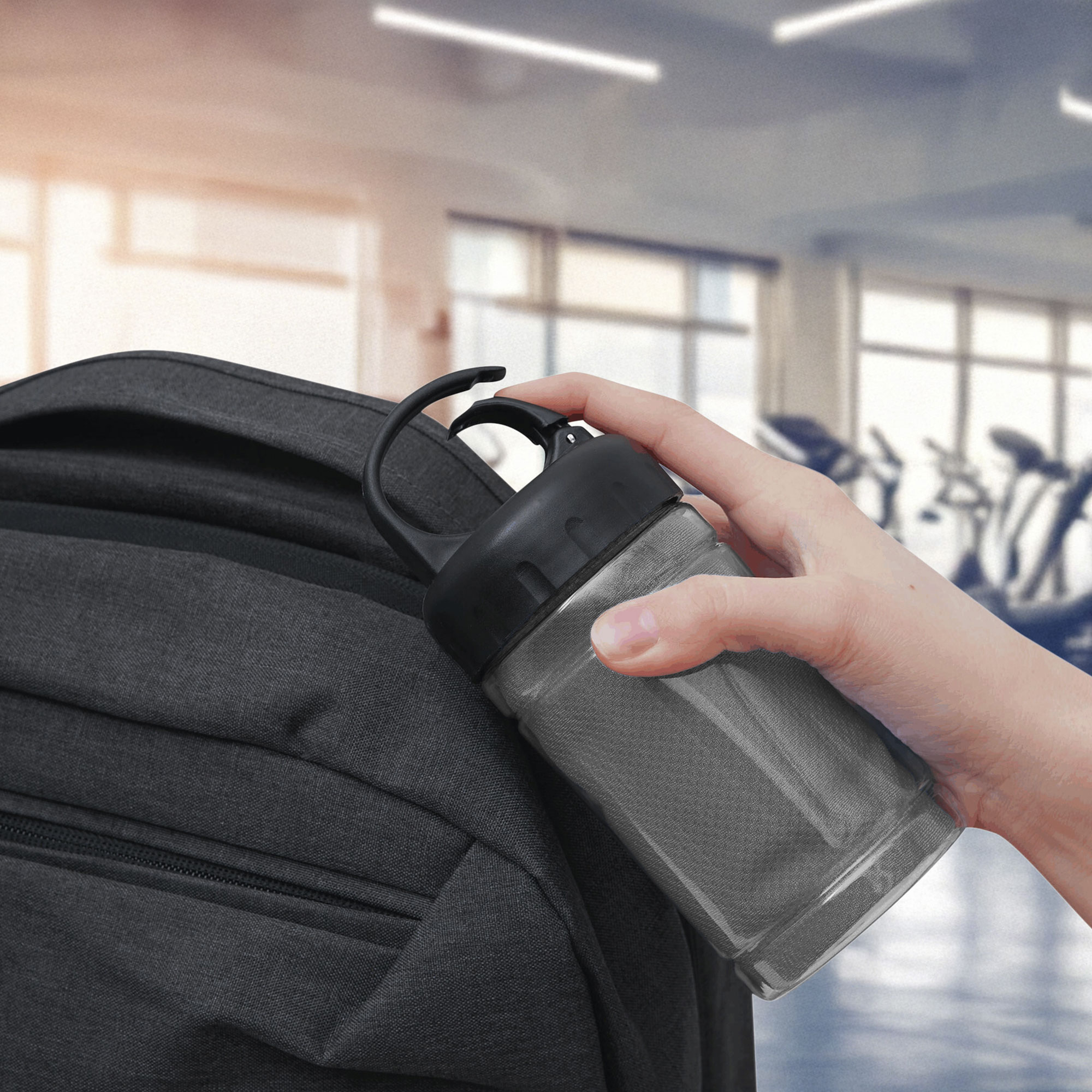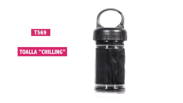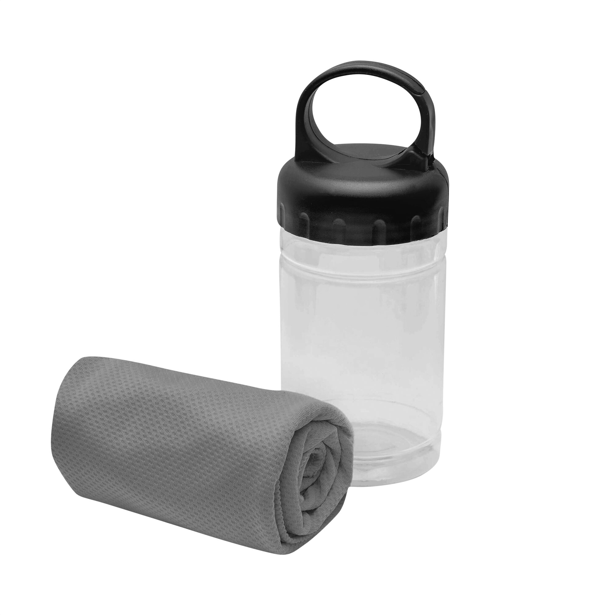 Medidas toalla 79 x 29 cm / Medidas frasco:  Ø6,5 x 17 cm. Políester. Toalla de enfriamiento en un estuche de plástico transparente. Para un efecto refrescante humedezca la toalla con agua o agregue agua en el cilindro e incorpore la toalla. Tapa a rosca con mosquetón.