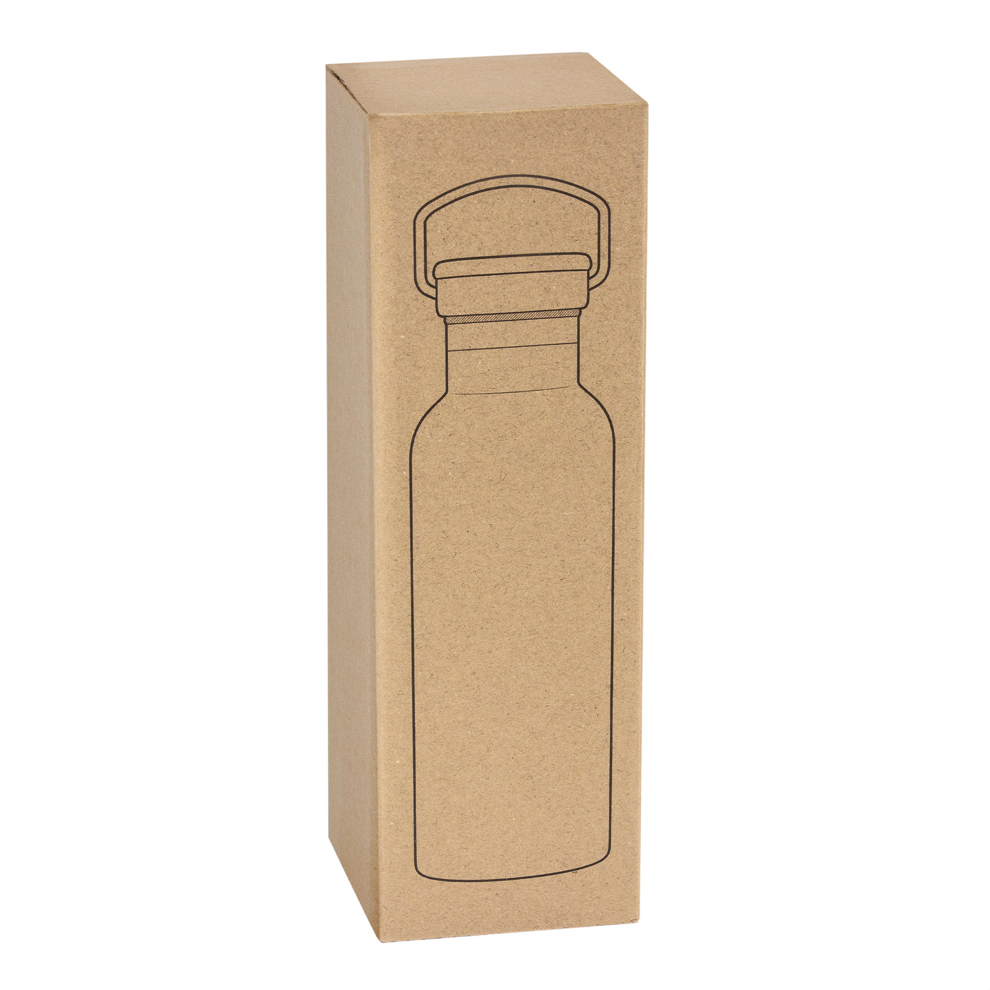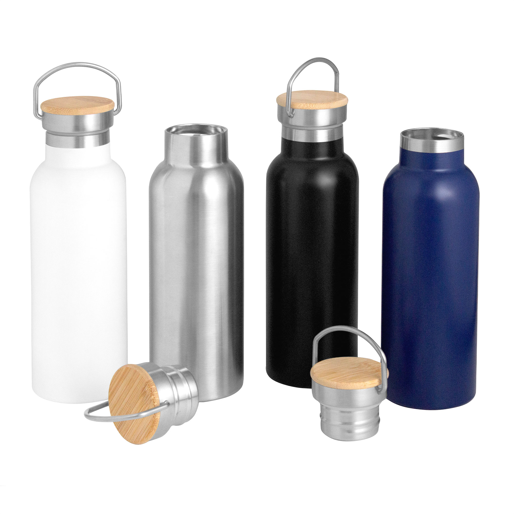 Ø 7,2 x 22,3 cm. Capacidad 550 ml. Acero inoxidable. Botella térmica doble pared sellada al vacío. Interior en acero 304 y exterior en acero 201. Tapa de acero inoxidable con manija metálica rebatible y detalles en bambú. Anillo de silicona antiderrame. Mantiene hasta 12 hs la temperatura de las bebidas calientes y 24 hs de las bebidas frías. Presentación en caja de regalo Kraft.