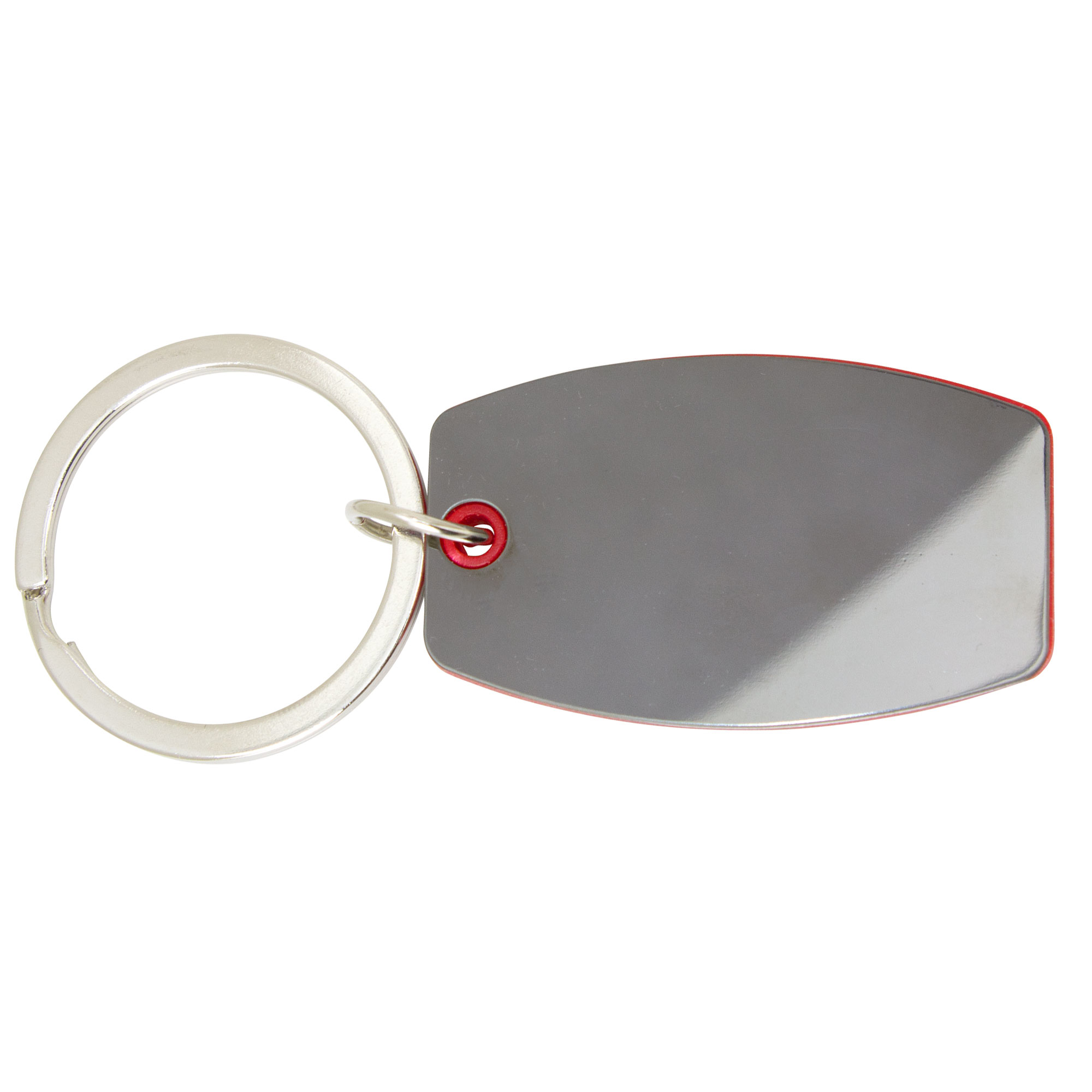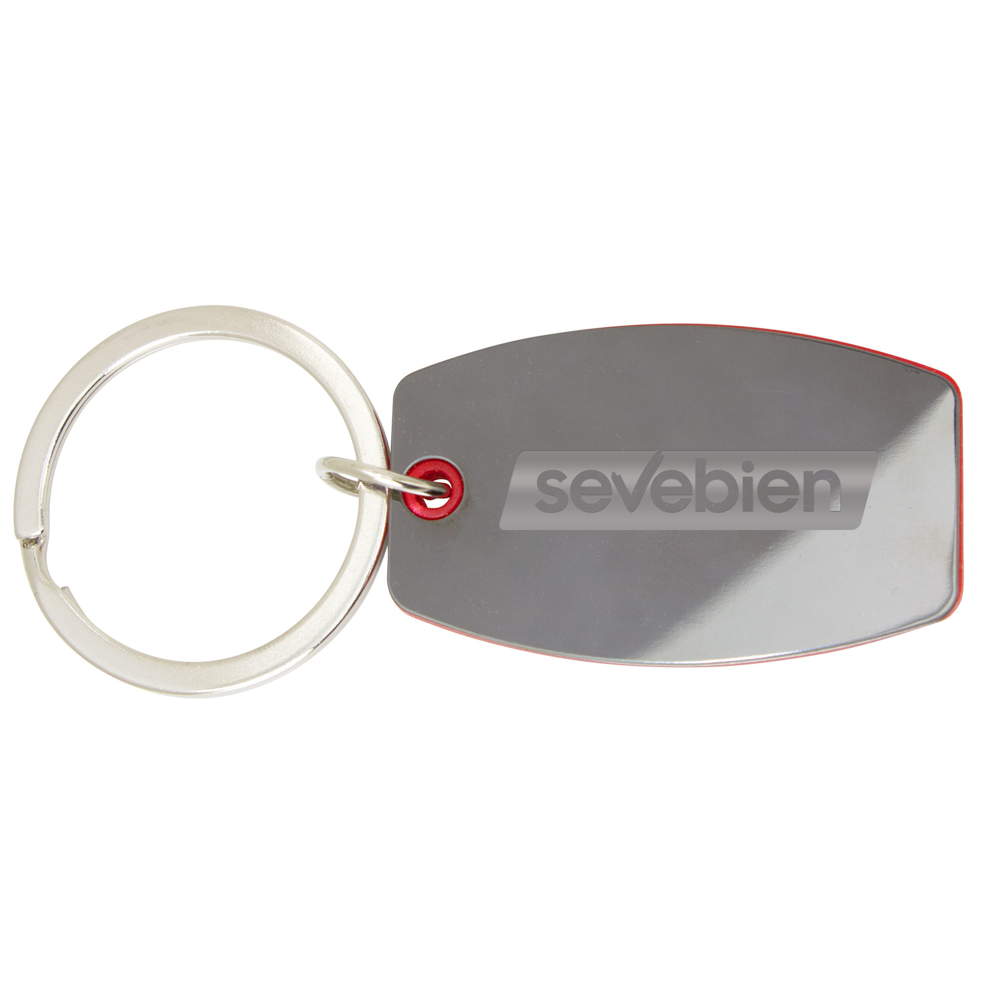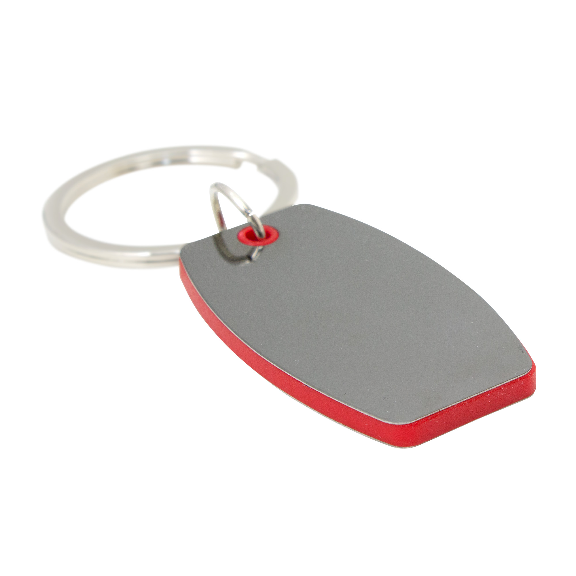 Llavero con forma ovalada. Estructura plástica de color con apliques de acero color gris gun de cada lado. Acabado brillante.