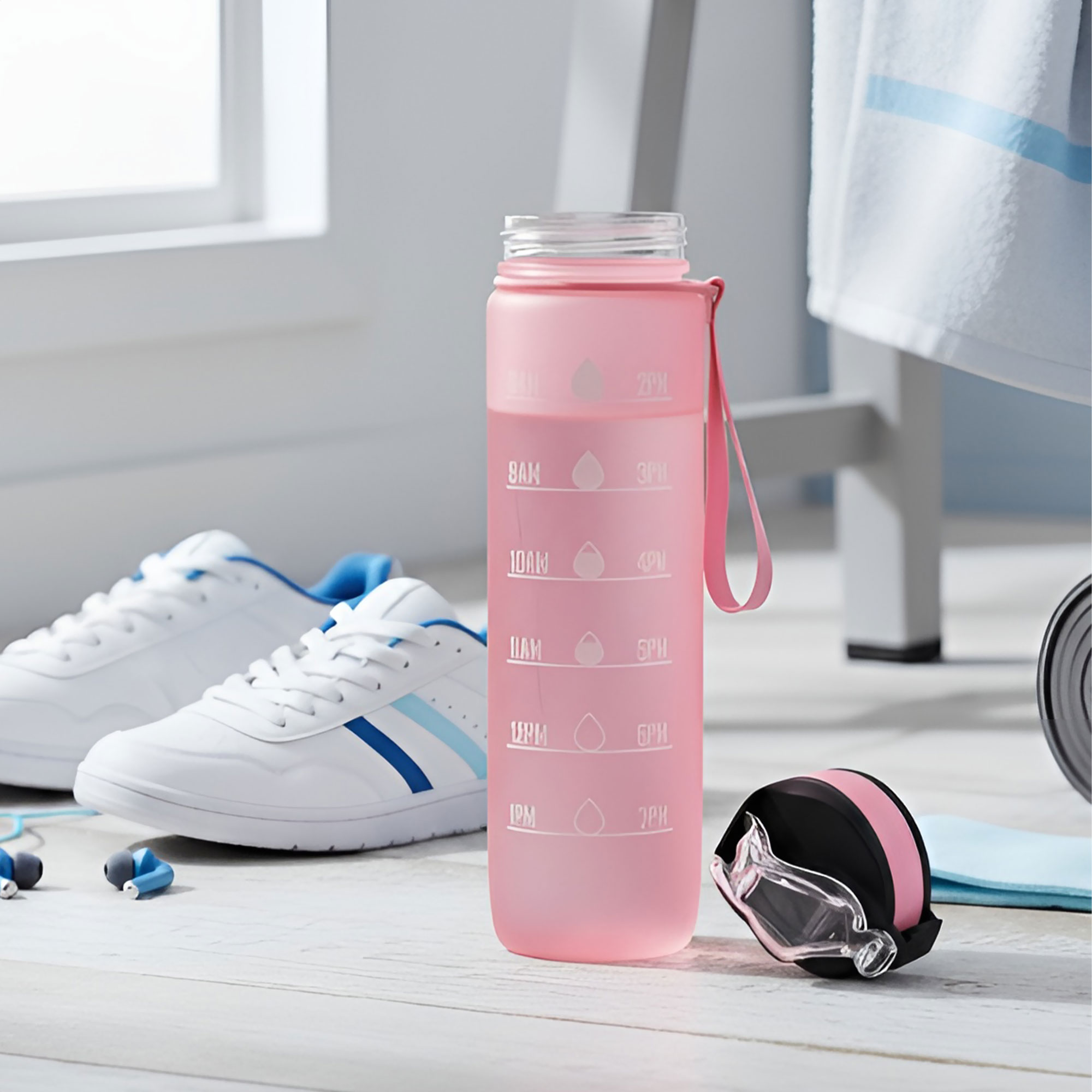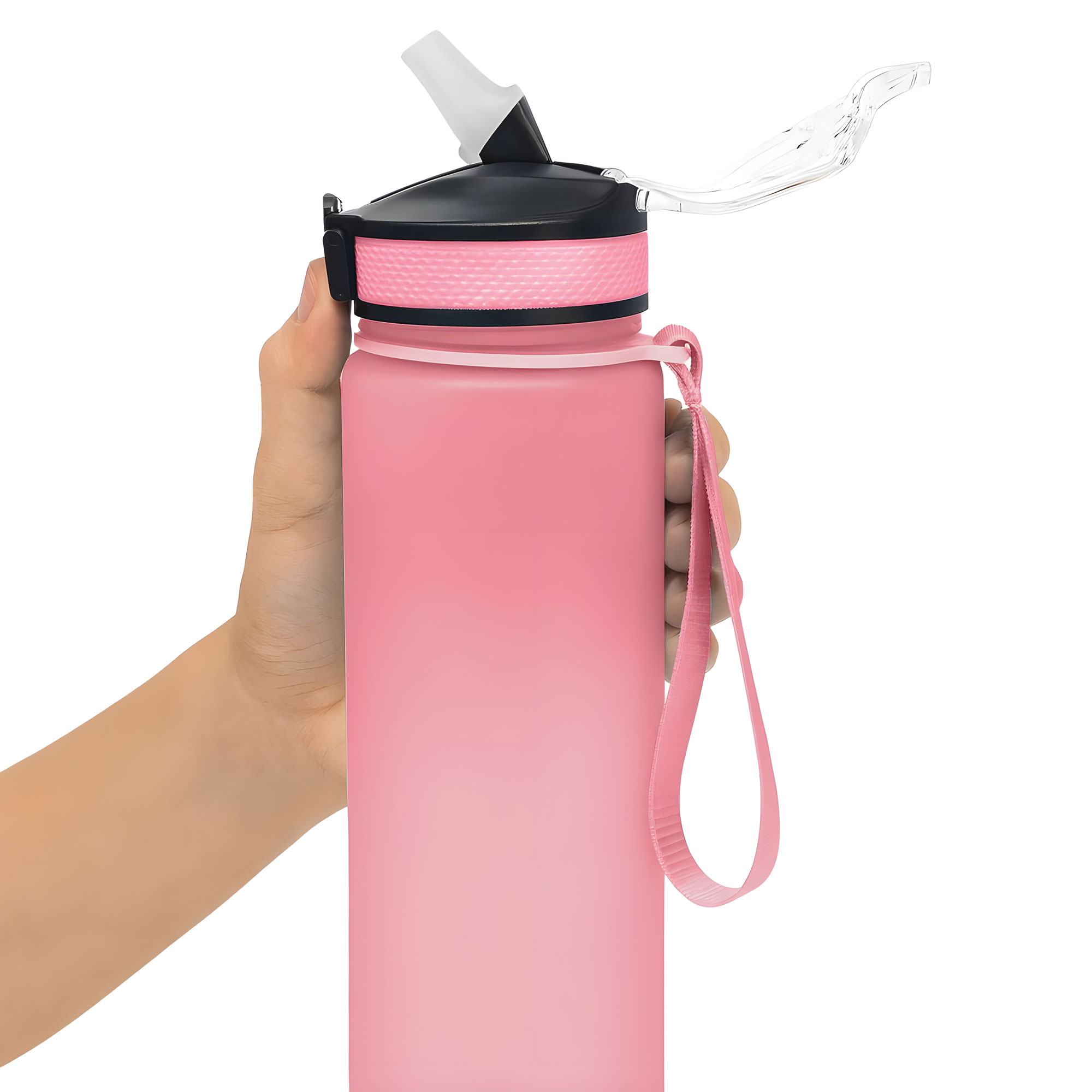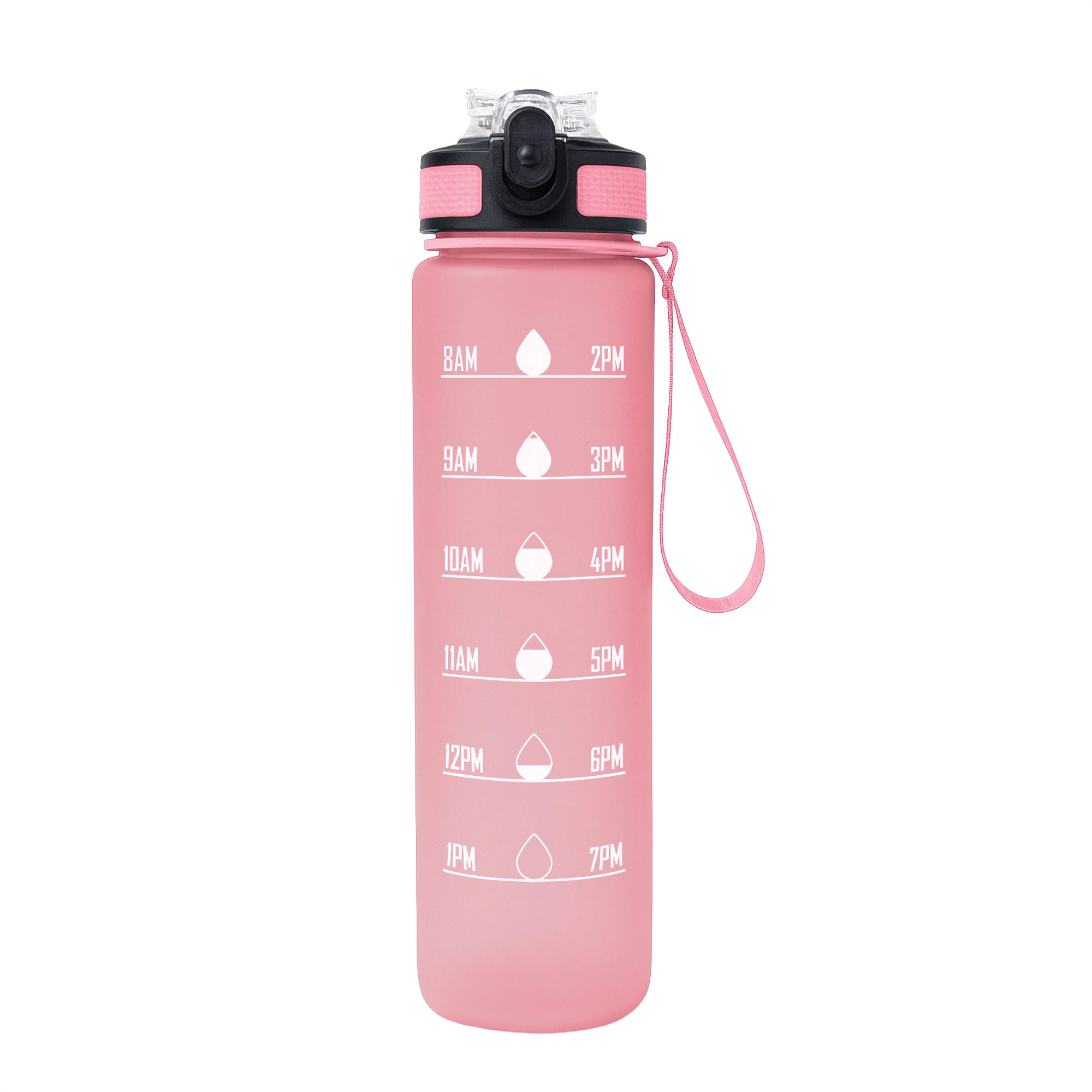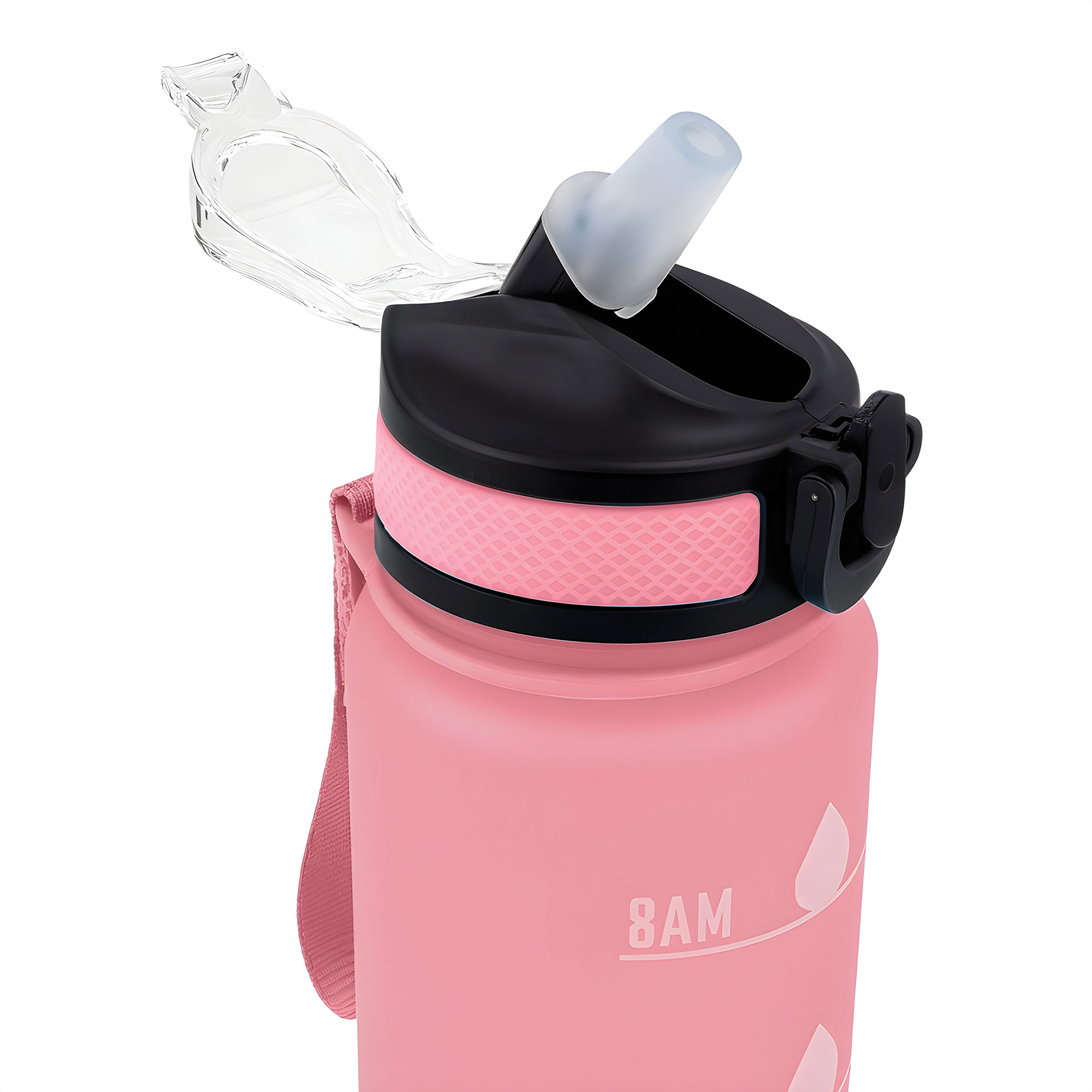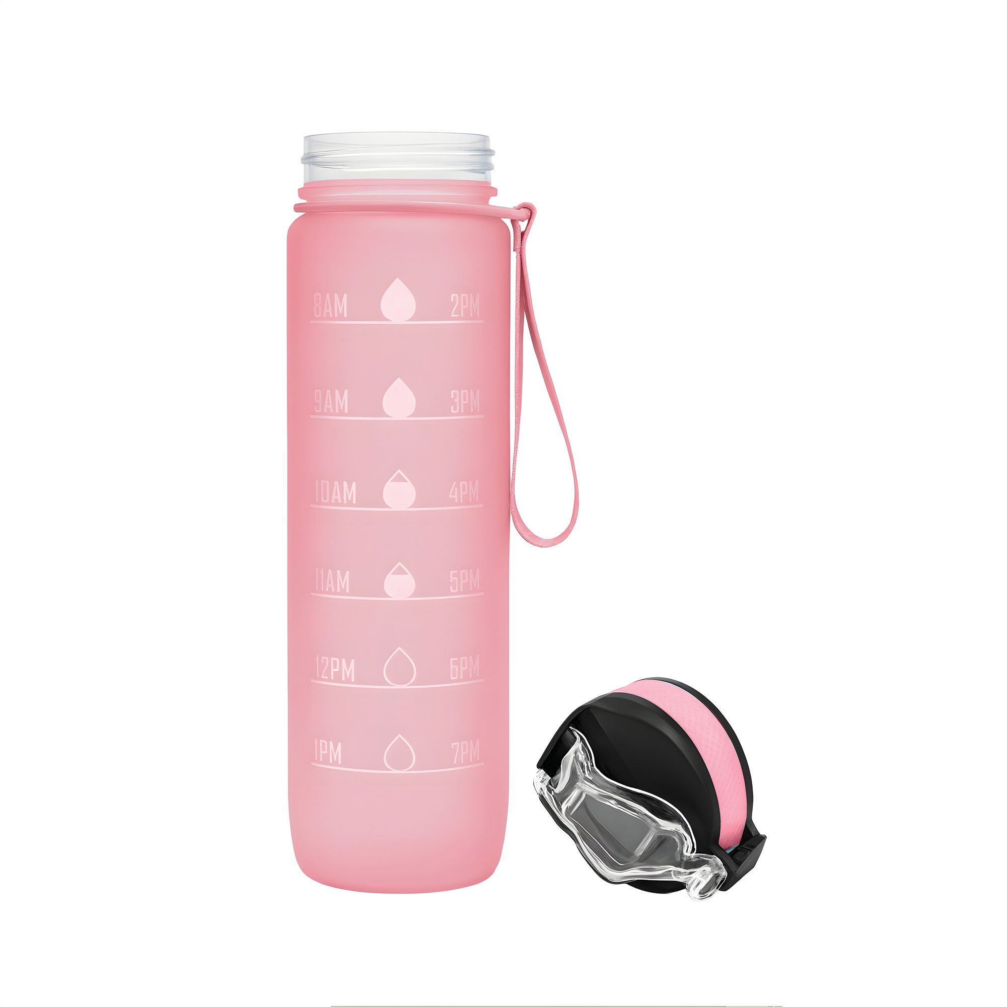 Botella con marcador de tiempo y medida. Color pastel con acabado frost. Tapa plástica combinada en color negro con el de la botella. Apertura rápida, boquilla transparente rebatible y sorbete incluído. Correa del mismo color de la botella.
